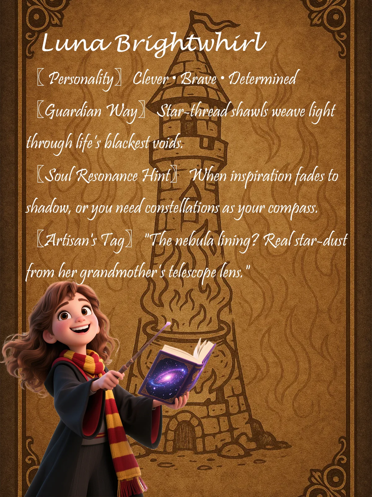 Luna grew up mapping constellations in her grandmother’s observatory, but her grandmother’s old telescope was missing its lens. Luna taught herself to spin star thread so she could “weave the sky back together.” She joined Sparkwing to learn how to mix courage with creativity—and light the darkest nights.